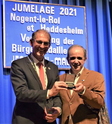Bürgermeister Michael Kessler überreicht seinem früheren Amtskollegen Jean-Paul Mallet die Bürgermedaille von Heddesheim.
