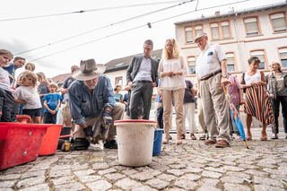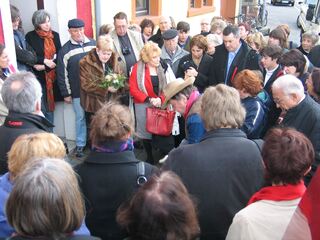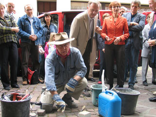 März 2008: Von Menschen umringt, verlegt Gunter Demnig in Ladenburg seine Stolpersteine.