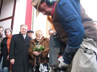 März 2008: Lea Weems beobachtet im Beisein von Bürgermeister Ziegler (l.), wie Gunter Demnig (r.) in Ladenburg Stolpersteine zur Erinnerung an ihre ermordeten Eltern verlegt.
