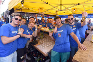 Die Gäste des Musikabends am Stadtbrunnen haben sich an den großen Ständen der beiden wichtigen Schriesheimer Sportvereine KSV und TV ausreichend mit Getränken eingedeckt.