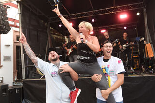 Tamara von der Band "Pusch " wird von TV-Handballern im wahrsten Sinne des Wortes auf Händen durch die Fanmeile getragen