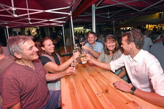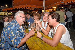 Zu den Gästen, die die Atmosphäre im Weindorf schätzen, gehören auch der Schauspieler Peter Nassauer (l.), seine Frau Stadträtin Gabriele Mohr-Nassaur (hinten links) und deren Freunde.