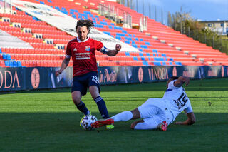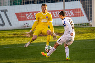 Anton Donkor trennt Markus Schwabl mit einer fairen Grätsche vom Ball.