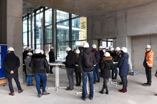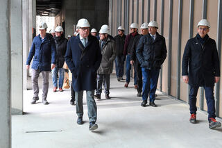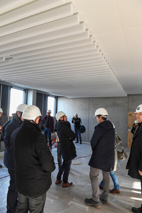 Links vorne OB Peter Kurz und rechts Jochen Endrich (GBG) beim Presserundgang durch das Neue Technische Rathaus. Bild: Ruffler