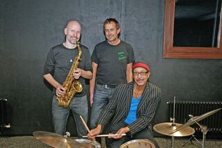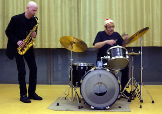 Eindrücke von Allen Blairman am Schlagzeug: Blairman und Saxofonist Olaf Schönborn gaben in Ilvesheims Schloss-Schule ein Konzert.