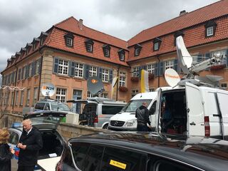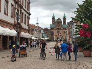 In der Fußgängerzone in Speyer, durch die am Abend der Sargwagen von Helmut Kohl zur Beerdigung im Adenauerpark fährt, wurden am Morgen unter anderem Podeste für die Kamerateams aufgebaut.