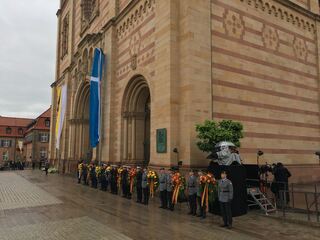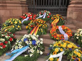 Vor dem Hauptportal des Speyerer Doms, in dem das Requiem für den verstorbenen Altkanzler Helmut Kohl um 18 Uhr beginnt, wurden bereits viele Kränze niedergelegt.