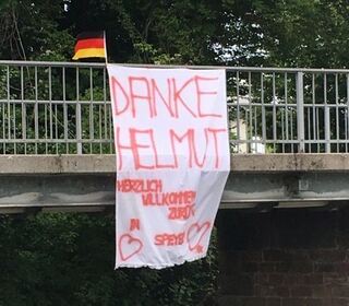 Kurz vor dem Schiffsanleger hieß ein Transparent den Trauerkonvoi von Helmut Kohl willkommen.