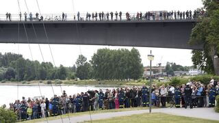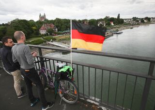 Zwei Männer warteten auf der Salierbrücke in Speyer auf das Schiff MS Mainz mit dem Sarg des Altbundeskanzlers Helmut Kohl.