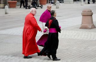 Kardinal Reinhard Marx (v.l.), der Speyerer Bischof Karl-Heinz-Wiesemann und Erzbischof Nikola Eterovic, Apostolischer Nuntius trafen vor dem Pontifikalrequiem für den verstorbenen Altkanzler Helmut Kohl vor dem Dom zu Speyer ein.