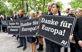 Zuvor hielten Mitglieder der Jungen Union hielten Schilder mit der Aufschrift "Danke für Europa!"...
