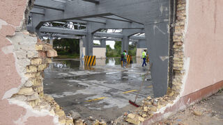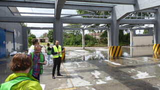 Die Buga-Projektleiter Volker Jurkat und Georg Bock erläutern, werden in zwei Schritten Teile der Halle abgerissen - oder „freigestellt“, wie der Fachausdruck heißt.