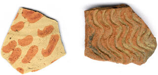 Es fanden sich auch eine Gefäßscherbe mit rotbrauner Bemalung (l.) und das Fragment eines römischen Ziegels.