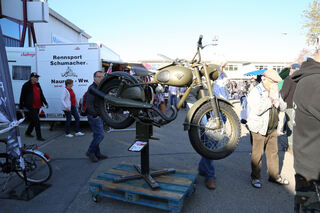 Aufgebockt war dieses seltene Militärmotorrad, um nach einem Käufer zu suchen.
