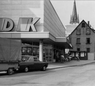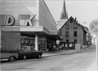 Ein Bild der Rathausstraße vom Spitalplatz bis Molitorstraße in den 1970er Jahren (v.l.): DK-Kaufhaus, Drogerie Müller, Haus Mandel und Schmuckgeschäft Kernbach.