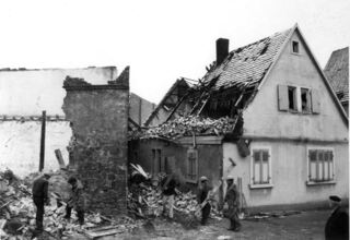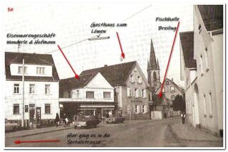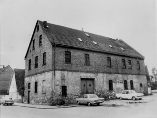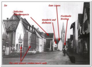 Die ehemalige Tabakscheune am Spitalplatz/Ecke Rathausstraße 57 wird 1968 abgerissen. Die Scheune gehörte ursprünglich dem Juden Sigismund Weißmann. Er musste sie während der Nazizeit an einen "arischen" Viehhändler für 13 000 RM verkaufen. Die Familie Weißmann wanderte am 19.2.1940 nach Barun/USA aus. Am linken Bildrand (teilweise bereits abgerissen) die Tabakscheune, welche von Otto Weißmann genutzt wurde. In der Bildmitte ist das Haus von David und Fanny Weißmann zu sehen. Ganz am rechten Bildrand ist ein kleines Stück Dach des Hauses von Siegfried und Erna Weißmann zu erkennen.