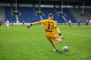 SVW-Keeper Timo Königsmann führt einen Freistoß tief in der eigenen Hälfte aus.