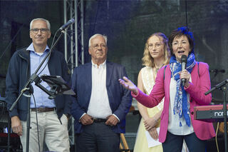(v.l.) Carsten Hoffmann (GGEW), Wolfgang Köhler (Seniorschef Privatbrauerei Bräustübl), Sonnenbotschafterin Charlotte I. und Bürgermeisterin Bärbel Schader eröffnen das Stadtfest.