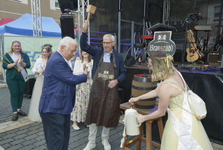 Erfolgreicher Fassbieranstich: v.l. Wolfgang Köhler (Seniorschef Privatbrauerei Bräustuebl), Carsten Hoffmann (GGEW) und Sonnenbotschafterin Charlotte I.