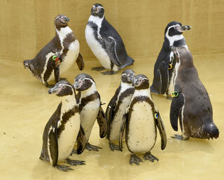 Zur Abfahrt bereit: Um die Pinguine einzufangen, haben die Pflegerinnen die Tiere früh morgens und bei kühlen Temperaturen in einem Becken versammelt.