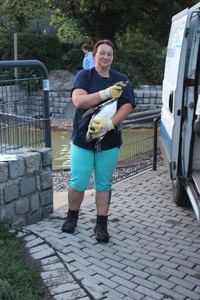 Manuela Roth, Leiterin des Vogelreviers im Luisenpark hebt einen Pinguin in die Transportbox.