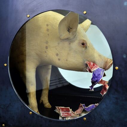 "Marie Cochon " (2012-2016) von Nikolaus Eberstaller: Plastiniertes Hausschwein in einer Vitrine aus Baustahl mit Sicherheitsverglasung.