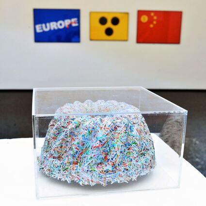 "Geldkuchen " (2001) von Ingrid Pitzer: Original-Geldscheine, geschreddert und gepresst unter Plexiglas.