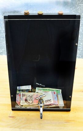 "Wortfalle: Etwas auf die hohe Kante legen und immer fluessig sein" (1968) von Daniele Spoerri 1968: Holzbox, Plexiglas, Wasserhahn, Geldscheine und Münzen.