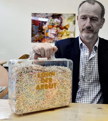 Der Berliner Sammler Stefan Haupt mit dem Kunstwerk "Lohn der Arbeit II " (1994-2001) von Victor Bonato: einem Plastikkoffer mit Schreddergeld.