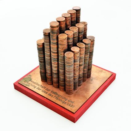 "Filiale " (1997) von Vollrad Kutscher: Original- Ein-Pfennig-Münzen auf Kupferplatte und Holz.
