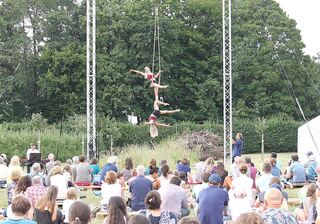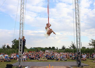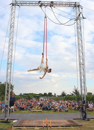 Stets unter den wachsamen Augen ihres Mannes Jochen (links am Trapezgestell) bezaubert Luftakrobatin Avital Pöschko vom Unterwegs-Varieté am Himmel über dem Obsthof Schuhmann ihr Publikum.