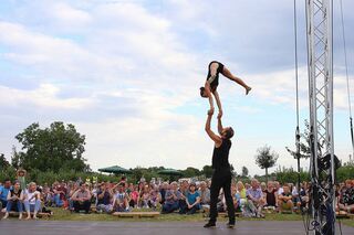 Chris & Iris, zwei ebenso gefragte und preisgekrönte Hand-auf-Hand-Akrobaten, verfehlen ihre großartige Wirkung aufs Publikum nicht.