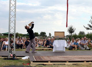 Unterwegs-Varieté auf dem Obsthof Schuhmann: Mr. Dee macht als Conferencier und Zauberclown viel Spaß.