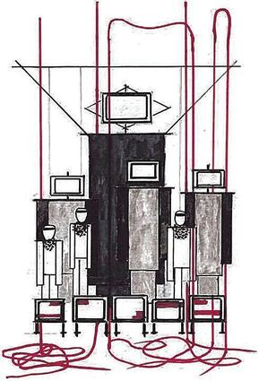 Heym: In den Bildschirmen erscheinen die Köpfe, geschminkt und maskiert. Unser Publikum entscheidet wie im echten Theater, ob es auf der Bühne nach links oder rechts auf den Schauspieler schaut, ob nach unten auf den Chor oder nach oben zu den Göttern. In Film und Fernsehen sind diese Blickwinkel per Kameraführung und Schnitt vorgegeben - freilich als Kunstwerk anderer Art. Unsere Arbeit ist wie Theater, es ist so nah wie Theater nur sein kann, denn das umhergehende Publikum kommt an die Gesichter näher heran als ihm das vom Zuschauerraum her möglich wäre. Es ist eine grandiose Findung - es ist besser als Theater!