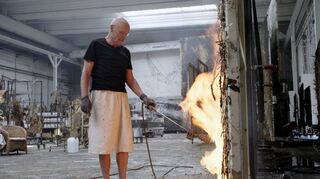 Zwischen solchen, in sanft hügeliger Landschaft, inmitten eines lichten Waldes, schwebt zunächst scheinbar schwerelos Franz Lustigs („Palermo Shooting“) Kamera. Weiße, ausladende (Braut-)Kleider, mit Gips verfestigt, sind zu sehen. Die Köpfe, ersetzt durch Steine oder Glassplitter, fehlen. Eine gespenstisch anmutende Modeschau. Instinktiv erinnert man sich an „Aufzeichnungen zu Kleidern und Städten“, Wenders’ Hommage an den Designer Yohji Yamamoto. Dann ein harter Schnitt. Der nächste Schauplatz ist Kiefers Atelier nahe Paris. Eine riesige Fabrikhalle, vollgestellt mit überquellenden Stellagen und abstrakten Kunstwerken. Mittendrin Anselm Kiefer, der sich in den Endlosgängen auf dem Fahrrad fortbewegt.