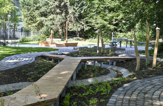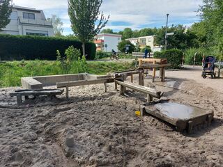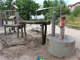 Klein, aber fein ist der Wasserspielplatz, der mitten in einem ruhigen Wohngebiet liegt. Genauer gesagt ist er Teil eines öffentlichen Spielplatzes, der neben einem großen Sandkasten auch über Klettergerüste und eine Rutsche verfügt. Eine Grünfläche bietet gemeinsam mit Sitzmöglichkeiten auf Steinen und Bänken Platz zum Verweilen.