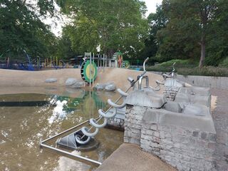 Der Wasserspielplatz im Herzogenriedpark befindet sich seit Juni 2025 an einem neuen Standort. Wo früher der Minigolfplatz lag, ist eine neue Spielanlage entstanden. Unter dem Motto "Flusslandschaft" spieglet der Spielplatz die geografische Lage Mannheims wider: an zwei Flüssen.