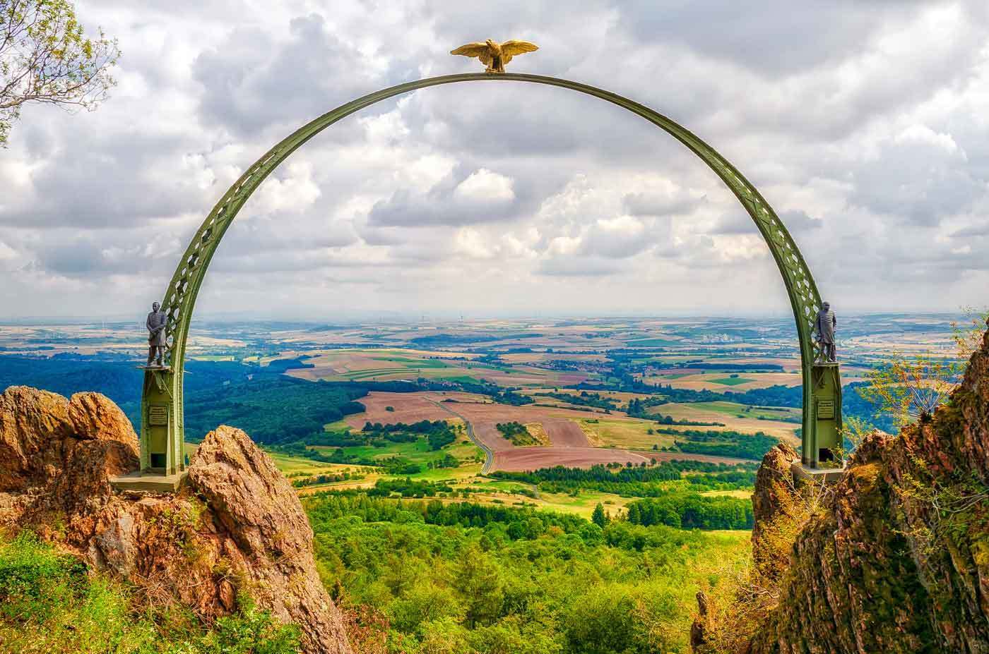 Auf dem Donnersberg erhebt sich der Adlerbogen am Moltkefels und bietet eine beeindruckende Aussicht auf die Donnersberg-Region. Dieses Denkmal wurde als Hommage an den Generalfeldmarschall Graf Helmuth von Moltke und den Reichskanzler Otto von Bismarck errichtet. Im Verlauf des Zweiten Weltkriegs wurde der Adlerbogen durch amerikanische Truppen zerstört. Nach einer gründlichen Restaurierung im Jahr 2016 erstrahlt er heute wieder in seiner vollen Pracht.