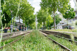 Die Steubenstraße ist ein zentraler Verkehrsknoten in Neckarau. Sie kann nicht nur mit dem Auto oder Fahrrad befahren werden, auch eine Straßenbahnlinie verläuft parallel. Die Schienen liegen in einem grünen Teppich aus wilden Gräsern und werden von Bäumen umschlossen, sodass die Straße trotz des regen Verkehrs eher an eine ruhige Allee erinnert.