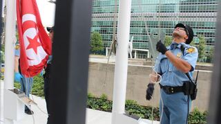 - Direkt am Zaun befinden sich die Fahnenmasten , an denen die Flaggen aller UNO-Mitgliedsstaaten (aktuell 193 und zwei Beobachter) sowie die UNO-Flagge gehisst sind, platziert in alphabetischer Reihenfolge der Staatsnamen in englischer Sprache.