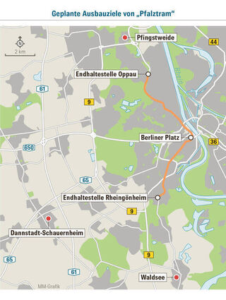 Im Westen ist eine komplett neue Linie vom Berliner Platz aus über die Gartenstadt, Maudach und Mutterstadt bis nach Dannstadt-Schauernheim im Gespräch. Im Süden sollen die bisher in Rheingönheim endenden Gleise über Neuhofen bis nach Waldsee ausgebaut werden.