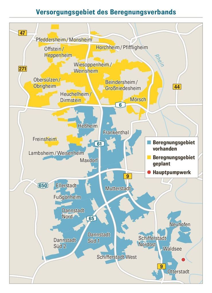 - Nördlich der A 6 steht nun nach längeren juristischen Auseinandersetzungen eine Erweiterung des Verbandsgebiets an. Im Bereich der Gemeinden Beindersheim, Bobenheim-Roxheim, Großniedesheim und Kleinniedesheim werden 725 Hektar an Fläche und 28 Kilometer Rohrleitungen dazukommen. Dieser Bereich wird jedoch voraussichtlich nicht vor 2024 ans Versorgungsnetz angeschlossen.