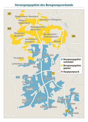 - Das Wasser aus dem Otterstadter Altrhein wird über ein Rohrleitungsnetz von 600 Kilometern Länge gepumpt, um damit eine Fläche 13 500 Hektar mit „Regen nach Maß“ zu versorgen.