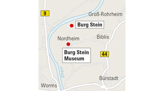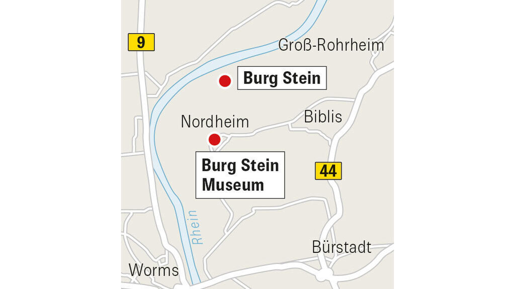 Nordheim. Besonders leicht ist sie nicht zu erreichen, die Burg Stein bei Nordheim. Außer man kommt mit dem Fahrrad über den Hessischen Fernradweg R 6 oder die EuroVelo 15, den Rheinradweg. Beide führen direkt an der Burg vorbei. Die Radfahrer müssen nur anhalten und ein paar Schritte laufen - und schon stehen sie inmitten der Grundmauern, die noch sichtbar sind. Sonst haben sich allerdings keine oberirdischen Bauten erhalten.