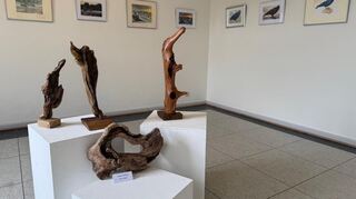 In der Mitte des Raums, in dem dieses Bild hängt, zeigt Huber ungewöhnliche Skulpturen, geschaffen von der Natur: Schwemmholz aus dem Neckar. Der Künstler selbst wählt sie vor allem aus. „Ich mache da ganz wenig dran“, erklärt er: „Ich mache es glatt, entferne, was stört und öle es am Ende ein.“ Seit fünf, sechs Jahren erst sammelt er dieses hölzerne Strandgut, um es aufzubereiten.