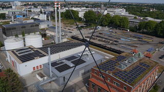 Auf den Dächern der Gebäude und Parkplatz-Überdachungen sieht man Solar-Panels aller Generationen seit 20 Jahren .