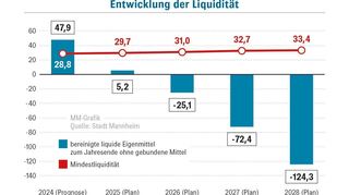 Nach Angaben aus dem Rathaus will das RP, dass die Stadt bis Ende 2028 wieder die sogenannte Liquiditätsreserve erreicht, die gesetzlich vorgeschrieben ist. Wäre Mannheim eine Privatperson, könnte man vereinfacht sagen: Die Liquiditätsreserve ist das Geld, das sie auf dem Girokonto verfügbar hat. Bis Ende 2028 wird sich hier nach der aktuellen Finanzplanung allerdings ein enormes Minus von rund 124 Millionen Euro anhäufen (siehe Grafik). Die für 2028 vorgeschriebene Mindestliquidität liegt dagegen bei plus 33 Millionen. So ergibt sich ein Defizit von rund 157 Millionen Euro, das umgelegt auf die vier Jahre bis dahin knapp 40 Millionen jährlich beträgt. Dieses Defizit, so das RP, müsse abgebaut werden - damit die Stadt für den Ausgleich möglichst keine Kredite aufnehmen muss. Bei Einnahmen und Ausgaben in einer Größenordnung von jeweils 1,7 Milliarden Euro pro Jahr klingen 40 Millionen zwar nach vergleichsweise nicht besonders viel - trotzdem werden die Einsparungen wehtun.