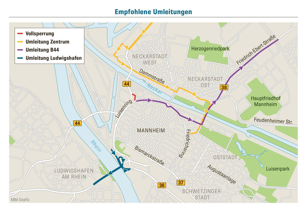 Umleitung B44: Luisenring Fahrtrichtung Friedrichsring: Kurpfalzkreisel – Friedrichsring – Collinistraße – Friedrich-Ebert-Straße (B38) Fahrtrichtung Mannheim Käfertal.