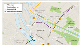 Umleitung Zentrum: Untermühlaustraße (B44) Fahrtrichtung Luisenring: Fardelystraße – Industriestraße – Bunsenstraße – Dammstraße – Schafweide – Friedrich-Ebert-Straße (B38) Fahrtrichtung Mannheim-Zentrum – Goethestraße.
