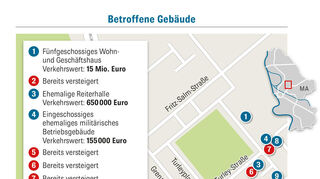 Dieses Gebäude (6) hat wie berichtet eine Bietergemeinschaft aus drei Personen für rund 800 000 Euro ersteigert. Die drei wollten sich nach der Versteigerung am Donnerstag auf „MM“-Anfrage nicht zu der Frage äußern, wer sie seien und was sie mit der Immobilie vorhätten. Bei einem der Männer soll es sich nach Recherchen dieser Redaktion um einen Mannheimer Baustoffhändler handeln. Er ließ am Freitag eine Anfrage dieser Redaktion unbeantwortet. Ein anderer ist nach „MM“-Informationen ein Bauleiter, der für eine auf Turley tätige Baufirma arbeitet.